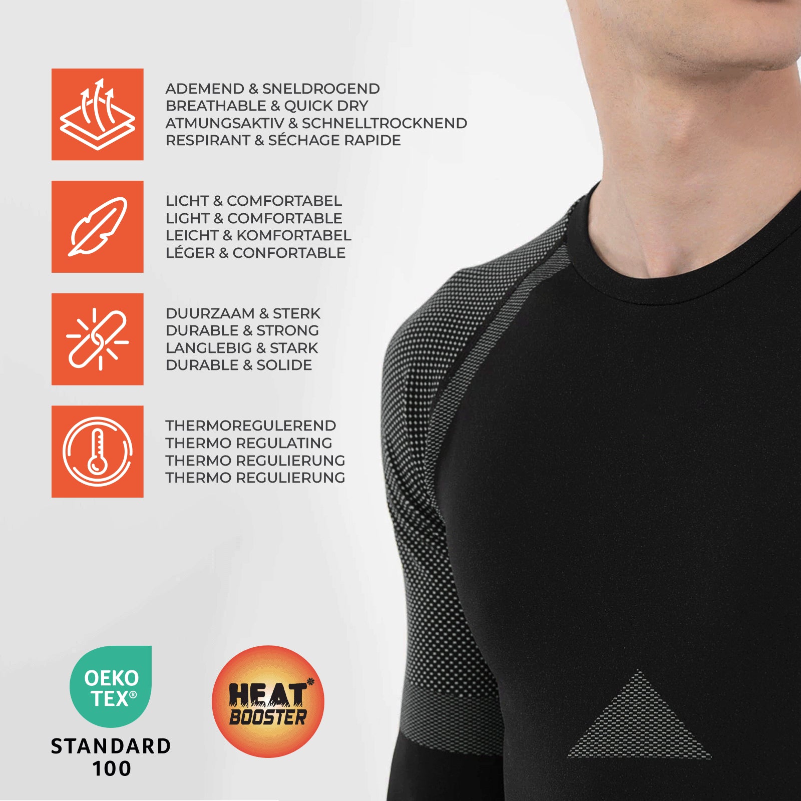 Blijf warm, droog en comfortabel in elke situatie met de HEAT BOOSTER® Naadloze Heren Thermo Ondergoed Set. Deze hoogwaardige thermoset is speciaal ontworpen voor mannen die ook bij lage temperaturen topprestaties willen leveren. Of je nu buiten werkt, sport, of gewoon geniet van een winterse dag – deze set houdt je lichaam op de ideale temperatuur.